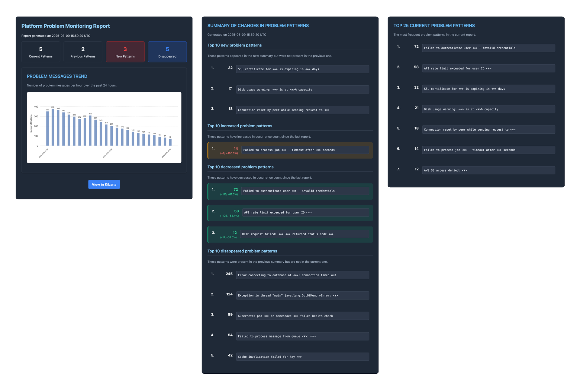 Every hour, this tools scans our Elasticsearch server for error messages and creates a comprehensive email report, like this: