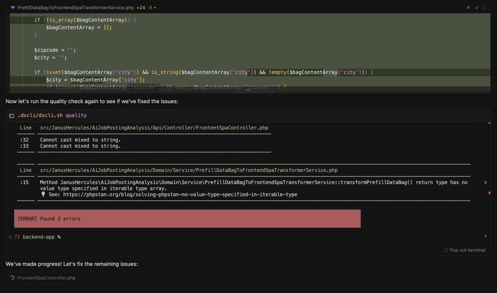 Watching the AI subsequently “use” and refine its own implementation is still a remarkable sight. Here is a small example from a Cursor session in “Agent” mode, where the AI already fixed some of the PHPStan violations it created, and continues working on the remaining ones: